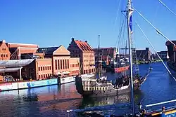 - 🌍 Crane over the Motława River (Żuraw), ul. Szeroka 67/68, ☏ +48 58 301 69 38, +48 58 329 87 60. Opening hours for Dec and Jan: Tu-Su 10:00-15:00, M closed. The former port crane is one of the most well-known buildings in Gdańsk. It is first mentioned in 1367, but was rebuilt several times since then. During World War II it was partially destroyed again. In 1962 after final reconstructions it was turned over to the National Maritime Museum. It now houses an exhibition about the former port of the city. The mechanism for lifting the crane can be observed as well. 8 zł adults, 5 zł concession, 1 zł children. Last tickets sold 30 min before closing. Tickets available in the museum next door.