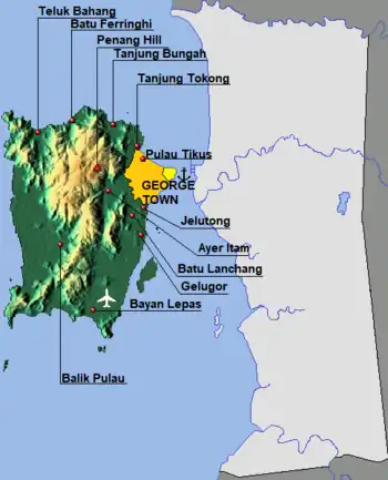 George Town, centred at the northeastern promontory of Penang Island, was granted city status by the British government in 1957. Since then, the city has grown beyond its original boundaries, and in 2015, the city limits were expanded to encompass all of Penang Island, as well as a handful of smaller islets just off the island's coast, including Jerejak Island.