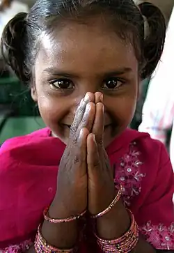 - Namaste, or Namaskar is simultaneously a verbal greeting and a physical gesture. As the word is pronounced, the speaker presses their hands together, palms touching and fingers pointing upwards, with thumbs pointing towards and close to the chest. The speaker will also offer a slight bow to the person they're greeting. Of Hindu origin, the greeting is used throughout the Indian Subcontinent, and among various South Asian diasporas around the world. The Thai wai is a similar gesture, used in greeting and while saying goodbye, and also to thank someone or apologize to them.
