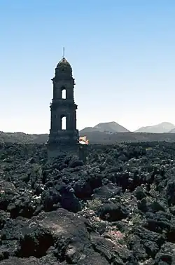 Spires from the Church of San Juan Parangaricutiro, surrounded by field of volcanic rock - 🌍 San Juan Parangaricutiro (near Nuevo Parangaricutiro, 18 km west of Uruapan, Mexico). in 1943, Parícutin, a new volcano sprang up in the middle of a cornfield in Michoacan. The volcano continued to erupt for 9 years, forming a 424 meter cone and covering an area of 233 square kilometers in ash and volcanic rock. The volcano then went dormant in 1952. Two towns were covered in the lava flow (San Juan Parangaricutiro and Parícutin), but the church spires from San Juan Parangaricutiro protrude well above the layer of volcanic rock that hides the rest of the town.