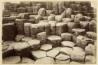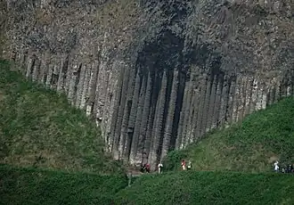Basalt layers are found worldwide, they form the dark maria or "seas" of the moon, are common on Mars, and are seen elsewhere in the solar system. The shape they take on cooling depends on conditions: here a thick lava flow cooled slowly, contracting slightly. This created a network of vertical fractures in a hexagonal pattern like mud in a dried-up lake-bed: it's the most energy-efficient way to dissipate the contraction stress. Horizontal cracks were wider spaced so as the basalt and other material eroded, this exposed tall black columns of about 0.5 m diameter, with a stepped appearance as upper segments washed off.