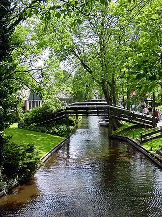 The village is small and has only 2,620 inhabitants. There are no roads in the centre, all transport is done by water over one of the many canals (but nowadays there is a cycling path). Venice has gondolas, Giethoorn has punters, traditional flatbottom boats that are used for transport over the canals. Giethorn has a long shape and is separated in three tiny settlements: Noordeinde, Middenbuurt and Zuideinde. The Dorpsgracht is the central canal that connects these separate settlements. The farms and houses are separated from each other by small canals. The bultrugboerderij is a common type of farm in Giethoorn. It seems to have a large bump because the barn is larger than the house in front.