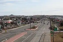The main roads are 59 (South Douglas Highway or Highway 59) and 14/16 (US Routes 14 and 16 or 2nd Street). Lakeway, Boxelder, and 4-J are the major arteries inside the city. Skyline (Highway 50), Southern Drive, Northern Drive, and Garner Lake Road form a ring around the city. Business areas are on 59, Lakeway, and 14/16.