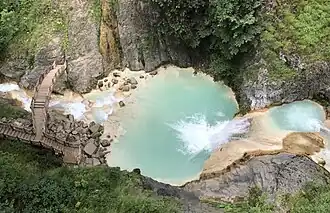 - 🌍 Kuzalan Nature Park (Kuzalan Tabiat Parkı) starts 47 km south of Giresun on D865 towards Dereli and Sivas. The first attraction is the waterfalls on the mountainside, with a roadside viewpoint. The stream cascades down for 1 km into Mavi Göl, "blue lake" for its soda-heavy waters. Take the boardwalk through the forest to its rim. 3 km further on, the flow is slowed and its minerals are deposited into a series of Pamukkale-like travertine pools, at Göksu Travertenleri. Here the road zags south to continue up the mountain.