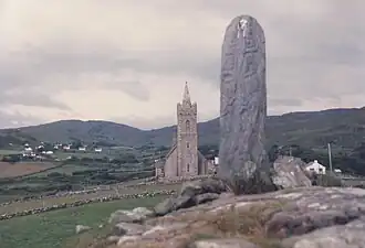 - St Columba's Church (Church of Ireland) was built in 1828. There's a 10-m stone set into the west wall of the graveyard which was probably part of a court tomb (like Cloghanmore, below) then was used for monastic buildings. There's also scraps of an 8th-century souterrain. The east side of the graveyard is Catholic, with an intricately carved pillar, now broken. 100 m west of the church is a 1.85-m stone pillar inscribed with a cross.