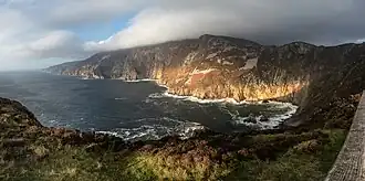 - 🌍 Slieve League (Sliabh Liag). It is a mountain of 596 m (1955 ft), with its south face etched into great sea-cliffs. The usual viewing point is Bunglass: branch off R263 into Teelin. You can park in the upper car park (€5 for two hours, €15 for the day, toilets available), and walk 25 min along a paved quiet road. Or you can park for free at the visitors' centre (café, shop, toilets) and take a shuttle bus (€5-7 per person) up to the viewing platform (coffee and souvenir trucks, but no toilets). From the viewing platform, you can walk a moderately challenging trail along the cliffs for hours (pay first more than two hours parking, or watch your time). If money is tight, the you can walk 50 min from the visitors' centre to the upper car park along a busy road. Tourist guides will bend your ear about how much higher these are than the Cliffs of Moher, but they're sloping not sheer. South across the bay is Sligo's Ben Bulben. Trails lead to the summit of Slieve League: One Man's Pass and Pilgrim's Path will get your attention as they teeter along the sharp ridge with the wind blasting up off the cliff face.