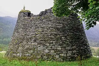 - 🌍 Dun Telve (2 miles south of Glenelg up lane to Balvaid). Always open. Two iron-age brochs (about 2000 years old) stand close together; they're some of the best preserved in Scotland, in spite of having their stone pilfered to build Bernera Barracks. Dun Telve, the larger, is a drystone tower 18.3 m in diameter and 10.2 m tall; its walls are 4.3 m thick at the base. The two brochs were "cleaned up" by officialdom in the early 20th century without any archaeological supervision, and have never been excavated. Free.