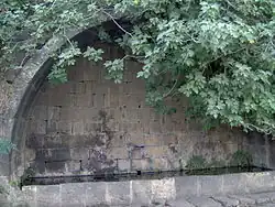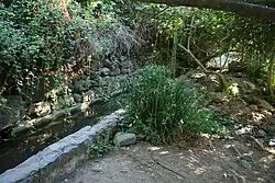 The spring and the built pool it feeds (2×1 meters in size and almost to deep to stand in) is in the heart of the ruins of a Syrian village, which was built upon a much more ancient settlement. You'll see some stone stairs going downwards, which you must take. At the bottom you'll see on your left a stone trough with running water. Turn right and cross the stream, in which a little water streams, until you reach a concrete pool. You can also turn right here and take a short trail through the bushes and trees to reach a giant fig tree and the spring, where water trickles out of the rock walls.