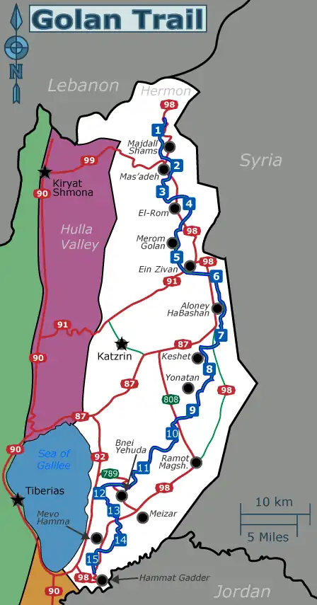 The Golan Trail (Hebrew Shvil HaGolan שביל הגולן) crosses the Israeli-controlled Golan Heights, from Mount Hermon in the very north of the territory, to above the Sea of Galilee at its south. It's a hiking trail, most of which is also fit for cycling and horseback riding. The trail is 120 km in length and usually takes 5-7 days, but since its path is pretty accessible to cars and by public transport, it's also possible to make a shorter hike by picking individual sections.
