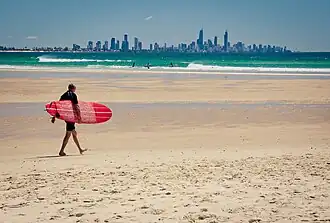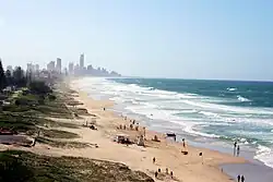 The Gold Coast is a large city along the coast in the southeast corner of the state of Queensland in Australia. The year-round warm weather, theme parks and many beaches just south of Brisbane have made it a popular destination with travellers. Surfers Paradise forms the glitzy hub of tourist activity. Each year thousands of Australian students complete their secondary education by indulging in Schoolies Week by travelling to the Gold Coast for a week of partying.
