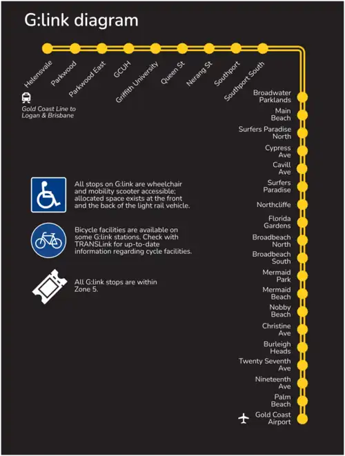 G:Link (Gold Coast Light Rail) provides the main form of public transport along the Gold Coast. The route travels from Helensvale Station via Gold Coast University Hospital and Surfers Paradise to Broadbeach South. The trams run from 5AM till midnight on weekdays and 24 hours on weekends running every 15 minutes or less in the hours of 5AM till midnight.