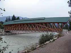 - π Kicking Horse Pedestrian Bridge (downtown Golden). The longest covered, free-span timber-frame pedestrian bridge in Canada, over the Kicking Horse River. Built by volunteers from around the world, it won the Communities in Bloom, Most Innovative Project for 2001. It intersects with a walking trail that circles the town, and is great for photos.
