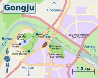 At the other end, Gongju's "old" intercity bus terminal is a mere 200 m south of the main entrance to Gongsan Fortress. Note that in open defiance of the label, the "old" bus terminal is still very much in use and far more central than the primary one, which is on the north bank of the Geumgang River, opposite Gongsan Fortress.