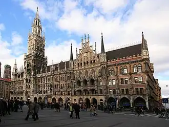 • Munich's Altes Rathaus is a Gothic building. Ironically, partly because its exterior is clean, it looks newer than the city's neo-Gothic Neues Rathaus, which was completed in the 20th century.