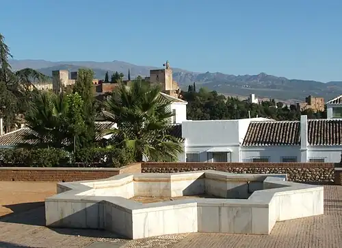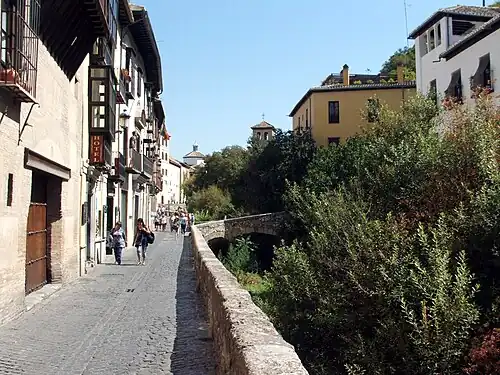 Entering the Albayzín is simple enough - from Plaza Nueva it's just a matter of walking north (uphill), or proceeding east along the Rio Darro (to the Paseo de los Tristes, covered below) and turning north on any of the side streets. However, if coming from the cathedral or anywhere else in central Granada, the best entrance is via 🌍 Calle Calderería Nueva (near bus stop Gran Vía 1), a stepped cobblestone street lined with Arabic restaurants, tea shops, bakeries and shops selling imported goods from North Africa. However once inside the Albayzín you'll find the layout of the streets very confusing, with many steep sections and stairways - though this is indeed part of the charm of the neighborhood, always with a new path to explore or a hidden surprise waiting to be discovered. However, if the climb or the confusing layout sound like too much, you can also take the C1 minibus to the top of the hill from Plaza Nueva.