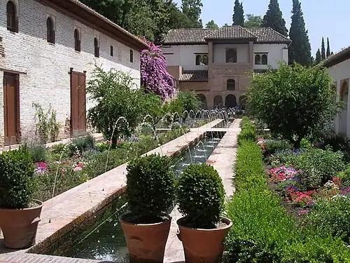 - 🌍 Generalife. The lush and gorgeous gardens of the Nasrid kings, the expansive Generalife is the finest set of Moorish style gardens in Andalusia, positioned on a hill situated at the rear of the complex overlooking the Alhambra palace. Within you'll find beds of colorful flowers, more exquisite architecture, leaping fountains and cool shade. There are two entrances to the Generalife, one at the ticket booth on the east side of the complex and another next to the Palacios Nazaries which will take you through the 🌍 Partal Gardens, a collection of palace gardens with flowing water streams and a large pool of water which reflects a nearby portico. From the Partal you can follow the Promenade of The Towers, the remains of the main wall and its adjoining towers that separate the Alhambra palace grounds from the Generalife. As you cross a bridge over a small canyon you'll enter the Generalife proper, where you can follow a promenade past the amphitheater to the Lower Gardens, a collection of hedge rows with rectangular ponds at the center and colorful flower beds throughout. Past this is the 🌍 Generalife Palace, the white structure sitting atop the hill and the highlight of a visit to the gardens, for it is within that you will find spectacular views, lovely architecture, and the much-photographed Court of the Main Canal, with its crossing jets of water that arc over the rectangular pool. Nearby is the Soultana's Court, another picturesque courtyard with leaping fountains. Above the palace are the High Gardens, where you can find a gorgeous long pergola and the Water Stairway, which true to its name is a beautiful stairway with water flowing down its parapets. The gardens are huge, but the layout is simple as everything in the Generalife can be seen along a long, circular path.