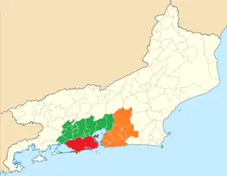 - Grande Niterói (Greater Niterói), the area of the metropolitan axis that has expanded across the Guanabara Bay, especially after the construction of the Rio-Niterói Bridge, constituted by the municipalities of Niterói, São Gonçalo, Itaboraí, Tanguá, Rio Bonito, Cachoeiras de Macacu, and Maricá. This sub-region is also known locally as Leste Metropolitano (Metropolitan East).