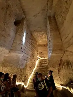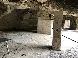 πRock Church of St. Michael delle Grotte,Calata Grotte S. Michele.The church was dug out of a single huge tuff rock probably between the 8th and 10th centuries, it also annexes other small caves near the main hall. In one of these, according to legend, the massacre of the inhabitants of Gravina by the Saracens took place during the third incursion in 999, an event remembered by an epigraph placed on the wall of the same cave. The human skulls and bones are visible there, however, more likely belong to corpses moved here during the 17th-18th century. On May 8th of each year it is the place for the celebration of the Feast of San Michele delle Grotte in memory of the legendary apparition of San Michele in a cave of Monte Sant'Angelo. On this occasion, the inhabitants of the neighborhood decorate the streets with the so-called "balloni".(updated Mar 2023)