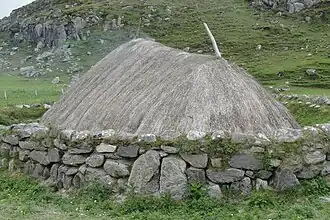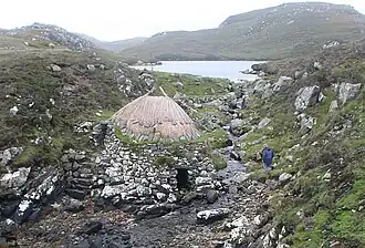 - π Norse Mill. Loch Breacleit drains out through two smaller freshwater lochs, and water-powered mills have long been set in the stream where it reaches the sea here at Loch Riosaigh. Traditional Norse mills set the wheel horizontally in the flow. This example was rebuilt in the 1880s, functioned until after the First World War then fell into disuse, but was again restored in 1995 and 2018. It's a two-storey beehive stone building covered in turf. The remains of much older dams and millstones can also be seen. The site's other advantage was that farmers could bring their grain by boat to the mill. Park at the museum and follow the lane east onto a footpath, which may be boggy.