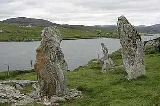 - π Callanish VIII (Cleitir) (Tursachan - Gaelic for "Standing Stone") (use parking lot at end of bridge). 24 hours. The name is because it's the 8th site associated with the Callanish standing stone complex. It's four stones in a semi-circle on a cliff edge overlooking the sea channel. This is believed to be the original layout, it's not that a complete circle was eroded. The Callanish complex was erected circa 2900-2600 BC, and remained in use for 1500 years. Free.