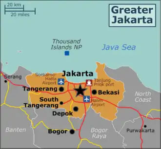 Greater Jakarta is a region in Western Java in Indonesia, including the national capital Jakarta and the surrounding region. It also spans areas of the provinces of West Java and Banten. The metropolitan area, which is one of the largest in the world, is also known as Jabodetabek. This travel guide covers this area with the exception of Bogor, which is in the article on Bogor Raya.
