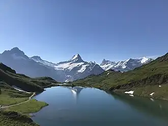 - Glaciers: two are visible southeast of the village. The Upper Glacier arises between the Schreckhorn and Wetterhorn. The Lower Glacier (pictured) is in the next valley south between Agassizhorn and Strahlegghörner, but in rapid retreat.