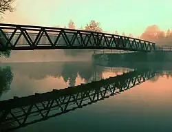 - π Timberframe pedestrian covered bridge (near Wyndham St S & York Rd). Built in 1992 by 400 Timber Framers Guild volunteers. A 120 ft (37 m) pedestrian lattice covered bridge over the Speed River.