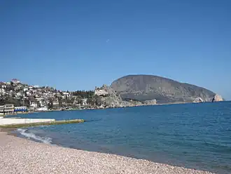 Ayu-Dag (Crimean Tatar: Ayuv Dağ Russian: Аю-Даг, Медведь-гора, Ukrainian: Аю-Даг means "Bear Mountain" in all three languages) is a nearby coastal peak and nature reserve. Its 572 m summit can be scaled from the Artek children's camp which lies at its base. Take minibus number 2 to Artek and find the trail up from there.
