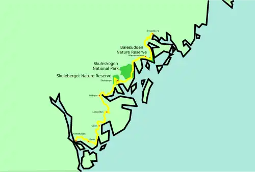 Beyond the gorge, a short climb leads to Slåttdalsberget at 275 m (902 ft), offering wide views of the forest and coastline. The trail then descends past Tärnättvattnen and continues toward the coast, where it passes Tärnättholmarna, a series of rocky islets. Passing Komponerar (ArkNat) before reaching 🌍 Näske marks the end of the national park section. An easy flat hike leads to 🌍 Köpmanholmen. Köpmanholmens hamn Stuga as well as Motte (ArkNat) are available here.
