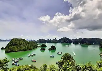 Ha Long Bay (also "Halong Bay"; Vietnamese: Vịnh Hạ Long) is in northern Vietnam, 170 km (105 mi) east of Hanoi. The bay is famous for its scenic ocean karst topography and is often included on lists of natural wonders of the world, including the UNESCO World Heritage list.