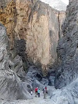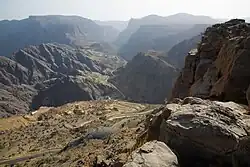 The canyon is accessed from the road ascending Jebel Shams and turning right near the village of modern Ghul. The trailhead for trekking path W6a begins by the abandoned village of 🌍 old Ghul. The road then passes by the village of Al Hajir, after which point the pavement ends. Here it quickly degrades into a rough track requiring 4WD, but persistence is rewarded with spectacular views of the 1000 m-high cliff faces. After 7 km the road ends at the village of 🌍 An Nakhur.