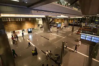 Connecting passengers can proceed to the transit area after walking along the walkway to the nearest security check and taking an escalator downward. Those heading to passport control for entry into Qatar must walk all the way to the South Plaza and take an escalator directly to the ground floor.