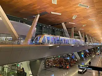 The Red Line of the Doha Metro serves the airport at the "Hamad International Airport T1" station. Because the line to the airport is separate from the main line, some trains will go to the airport while others will go to the southern terminus of Al Wakra instead, so check the destination signage. In addition, this means that trains running northbound from Al Wakra will not stop at the airport, so a transfer is needed to an airport train at Oqba Ibn Naife or others stations to the north.