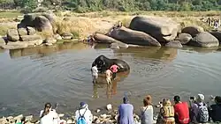 Many guest houses are on the other side of the river in Sanapur, Hanumanahalli or in between the two, in Virupapur Gaddi. To access them, you need to cross river with the ferry. The people operating it have a monopoly, so the service is extortionate and the operators rather rude. ₹50 per crossing, you'll have to wait until there are enough people to fill the boat. Last boat around 5PM, so forget about coming back after watching the sunset on the hill. If you cannot get on the boat, an auto will take you other side via Hospet-Hugli-Hanumanhalli for at least ₹1000, it's a 40-km tour. During moderate/high rains, gates of Tungbhadra dam are opened which increases the water level and water flow in river. In that case, one might get stranded on the other side of river (Virupapur Gadde area).