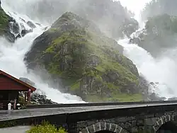 • 🌍 Låtefossen (Road 13 in Ullensvang, south of Odda). Striking waterfall. Road 13 runs on a fine bridge (constructed 1859 and still in use) across the waterfall. The road is constantly wet from the cascade. OSM directions target=_blank