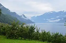 Hardanger is a traditional region in Hordaland, Norway. It comprises the Hardangerfjord, the surrounding shores and valleys, and related uplands, mountains and glaciers. Despite its location below the glacier and the rough highlands, Hardanger enjoys a mild climate and has for centuries been a centre for fruit production in Norway. Hardanger also include wild waterfalls, alpine summits, high plateaus and major glaciers.