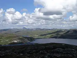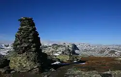 Hardangervidda is a barren, treeless mountain plateau at 1,100–1,200 m (3,600–3,900 ft) in elevation, with lakes, moors, rivers and streams. This kind of open, relatively even landscape is known as vidde in Norwegian. There are significant differences between the west side, which is dominated by rocky terrain and expanses of bare rock, and the east side, which is much flatter and more heavily vegetated. The prominent peak of Hårteigen (1,690 m/5,545 ft) is visible across much of the plateau.