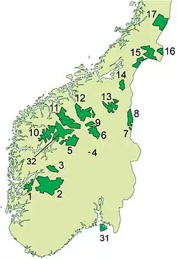 Hardangervidda National Park (Norwegian: Hardangervidda nasjonalpark) is a national park in the counties of Telemark, Buskerud and Hordaland in Norway. It is the largest national park in Norway proper, spanning half the Hardangervidda, which is the largest highland plateau in Northern Europe. The park protects Europe's largest wild reindeer herds. Along with Jotunheimen and other mountain areas it separates East and West Norway.