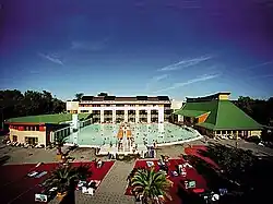 - 🌍 Medicinal spa and Outdoor swimming bath (Official: Therapeutic bath and public wellness complex of Harkány, Gyógy- és Strandfürdő, Harkányi Gyógyfürdő Zrt.), Kossuth L. u. 7 (Downtown), ☏ +36 72 580-830, info@harkanyfurdo.hu. Thermal spa: daily: 09:00-18:00, open-air bath: 25 Apr-12 Jun: 09:00-18:00, 13 Jun-20 Aug: 09:00-20:00, 21.Aug-28.Sep.: 09:00-18:00, 29 Sep-24 Apr: closed. The Harkány Spa was awarded the highest possible. Located in a many hectare park covered with grass and trees. Services: Healing water, Curative treatments, Drinking cure, Wellness & spa, Healing cosmetics, Dermatology. - Thermal Spa Pools: health pool, roofed; health pool, open; health pool, semi-open; top floor, whirlpool, roofed; two pools on top floor with jacuzzi, roofed; top floor, relax pool, roofed. All pool temperature of the water: 34-36°C. - Open-Air Bath Pools (eight units): sports pool, 'butterfly' pools, children’s pool, whirlpool, sauna cold plunge pool, slide & plunge pool. Different temperatures: 20-36°C. Adult/reduced/family ticket Ft 2900/2200/2900/adult +1100/children, Adult/reduced afternoon ticket (from 14:00) Ft 2200/1500 (2014).