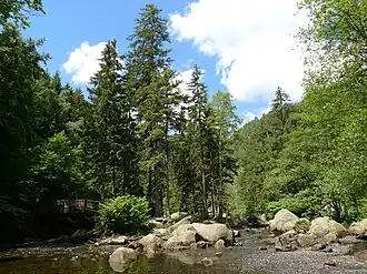 The Upper Harz plateau slopes from 1,000 m elevation in the west down to 485 m in the centre and suffers from a cold and damp climate, even in the summer, caused by its susceptibility to westerly winds. The Brocken rises above the plateau and is internationally famous for the stories and myths associated with it in local folklore and literature. The summit of the Brocken is bare and has an Alpine climate, but its lower slopes are forested and interspersed with moorlands and river beds.