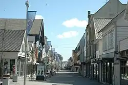 The city center of Haugesund is compact; the streets are on a grid and easy to navigate by foot. The main north-south street is Haraldsgata, which is for pedestrian only from Skjoldavegen (north) to Åsbygata (south). The parallel street Sørhauggata is one way south, while Strandgata is one-way north. The two blocks of Torggata between Sørhauggata and Strandgata is also pedestrianized.