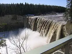 Coming from Edmonton, take Alberta Highway 2 north to Peace River and continue north on Alberta Highway 35 (Mackenzie Highway), which becomes Northwest Territories Highway 1 (Mackenzie Highway) as soon as it enter the Northwest Territories. At the junction in Enterprise, take Northwest Territories Highway 2 (Hay River Highway) towards Hay River for 35 km. The drive takes approximately 12 hours.