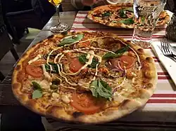 The restaurant is rather self-consciously a pizzeria. Although many other pizzerias in Helsinki also serve kebab, there are only pizzas on the menu here, and even the staff wear shirts saying "Sorry, no kebab".