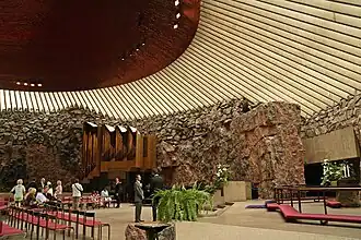- 🌍 The Church in the Rock (Temppeliaukion kirkko, literally "Temple Square Church"), Lutherinkatu 3 (Tram: 2), ☏ +358 9 494698. Daily 10:00-17:00, but if services or other activities (e.g. weddings) take place the church has limited access for tourist visitors. Phone +358 (0)9 2340 5940 for a bulletin on current activities. English services on Sundays at 14:00, open to the public. An atmospheric of minimalistic church, this church was literally dug out of solid rock. From above, it resembles a crashed UFO. The roof is made of 22 km of copper strips. Completed in 1969, this has become one of Helsinki's most popular attractions. Concerts are often held here thanks to the excellent acoustics. €5.