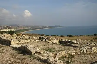 Ruins of ancient Heraclea Minoa, including remnants of Hellenistic walls and structures overlooking the sea.