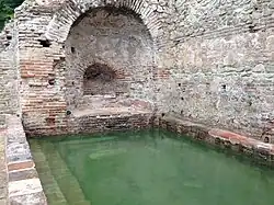 - 🌍 "Naked woman" fountain. A modern fountain with a statue of a nude woman, in the middle of a park. Immediately south of it there's a decorated colonnade (built 1960) with a mineral water drinking fountain hooked to the Momina Salza spring. Further along the alleys to the south there's another, smaller fountain with a boy with a ewer, and then the ruins of the Thermae.