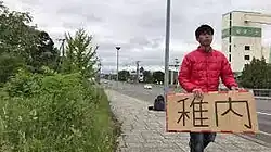 Brightly-coloured jacket, big sign... this guy will get to Wakkanai - A big cardboard sign with an indication of where you want to go can help. Short general directions like North, or West can be written bigger—and seen from further away—than a longer city or town, but a city is more useful for drivers.