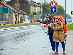 Hitchhiking is one of the cheapest ways of traveling. By tradition, hitchhiking is defined as soliciting a ride by standing at the edge of a road, facing traffic, with one's thumb extended/upwards. You can meet a lot of people and make lots of friends. You can also become very frustrated, or encounter danger on the way; today's drivers are more fearful of picking up hitchhikers than in the past. But it's also a great feeling to get a ride after you've been waiting for a long time. People who do pick up hitchhikers tend to be very friendly. However, hitchhikers also risk being picked up by someone who is an unsafe driver or even dangerous to their person.
