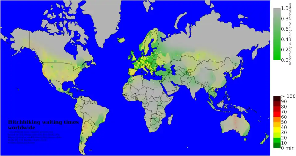 Below is a map showing the length of time hitchhikers in different parts of the world have reported waiting until they find a ride. The fainter the colour, the less certain the data are for that location, as of April 2024.