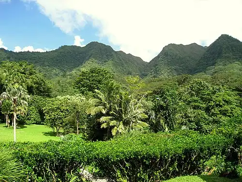 Manoa and Makiki are two prominent neighborhoods of Honolulu situated in the foothills of the Ko'olau Mountains north of Downtown Honolulu. Along with Nu'uanu, these neighborhoods sit within valleys which extend into the Ko'olau Range, varying in character from unpretentious bungalows, 1960s cinderblock walkup apartments and small businesses in the lower reaches of the neighborhoods to upscale apartment and condo complexes on the hillsides above. Manoa is best known as the home of the University of Hawai'i at Manoa, the main branch of the largest university in the Hawaiian Islands. Makiki sits beneath the Punchbowl crater, home to the National Memorial Cemetery of the Pacific, and gained fame as the birthplace and childhood home of former President Barack Obama.